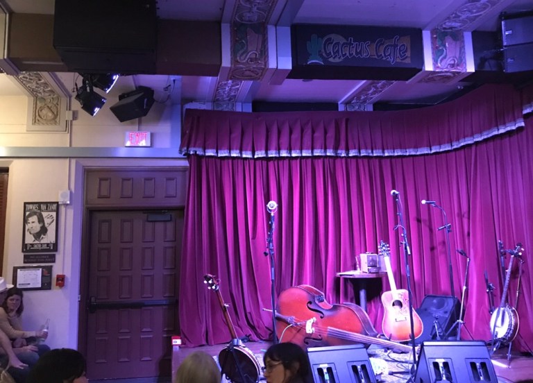 We’re in and seated. I love this place. Sturdy wooden seats, old posters on the wall advertising players past. Some signed; Lucinda, Ani, and Townes. You can feel the magic here.